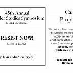 You are invited to submit proposals for presentation at the 45th Annual Lewis & Clark College Gender Studies Symposium, March 11–13, 2026, exploring dimensions of resistance, activism, and solidarity in relation to gender and sexuality. Please review the guidelines in our Call for Proposals.