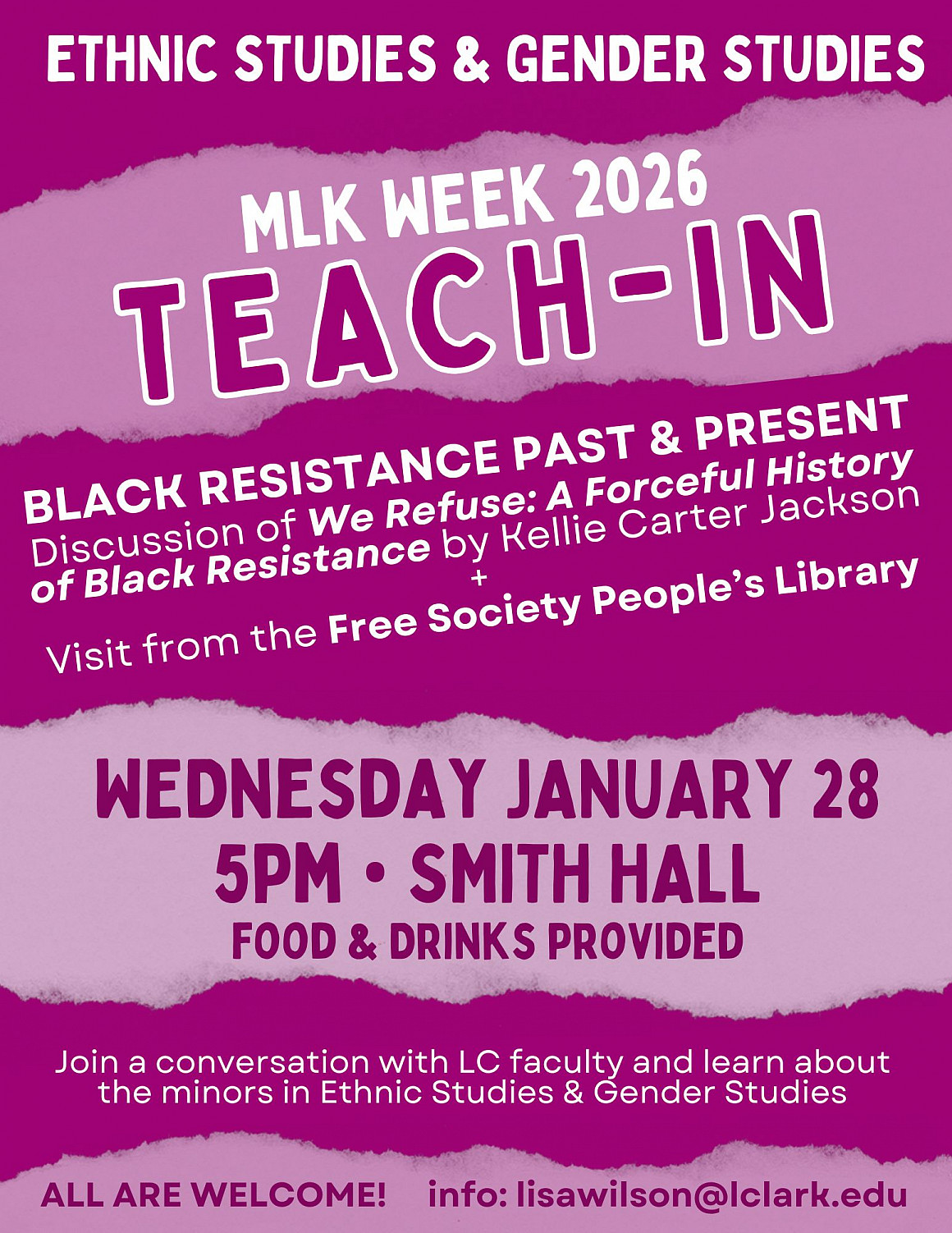 The Teach-In will include a visit from the Free Society People’s Library, a local radical bookmobile, which will be on campus with a curated selection of books related to MLK Week, Ethnic Studies, and Gender Studies.