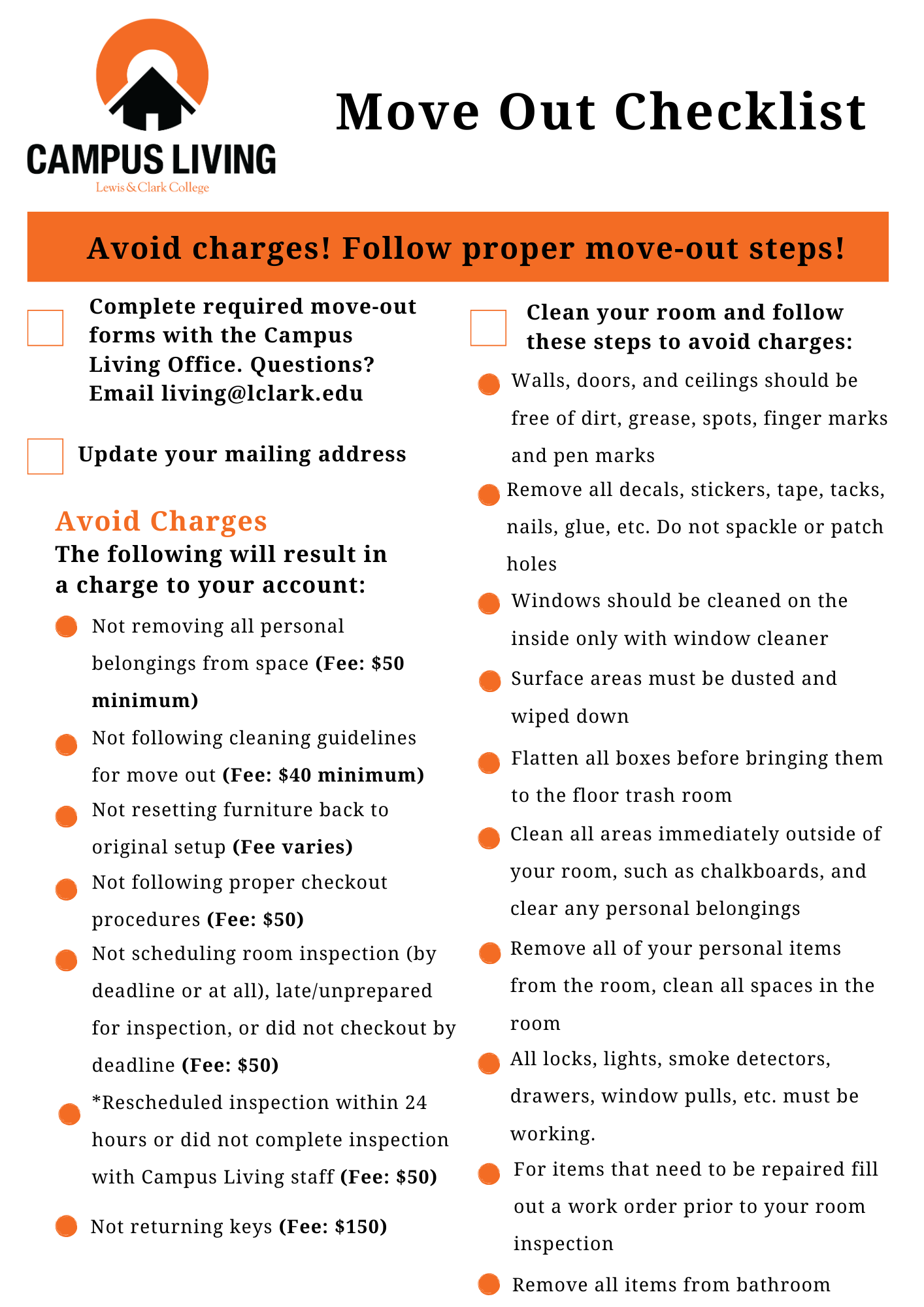 - If you don’t complete the form, we consider this an improper check-out and charges will be applied to your student account. You will be defaulted to Option A: Express Inspection. An RA will review your room at a later date and time to verify the condition of the space.